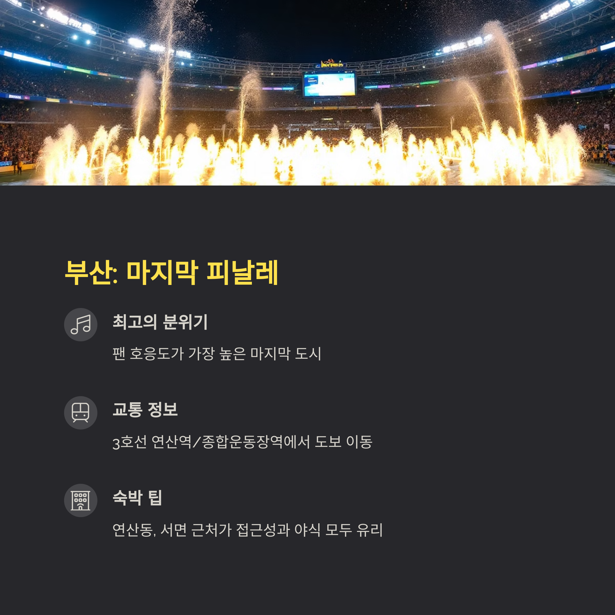 핵심: 숙박은 연산동, 서면 근처가 공연장 접근성과 야식 모두 유리